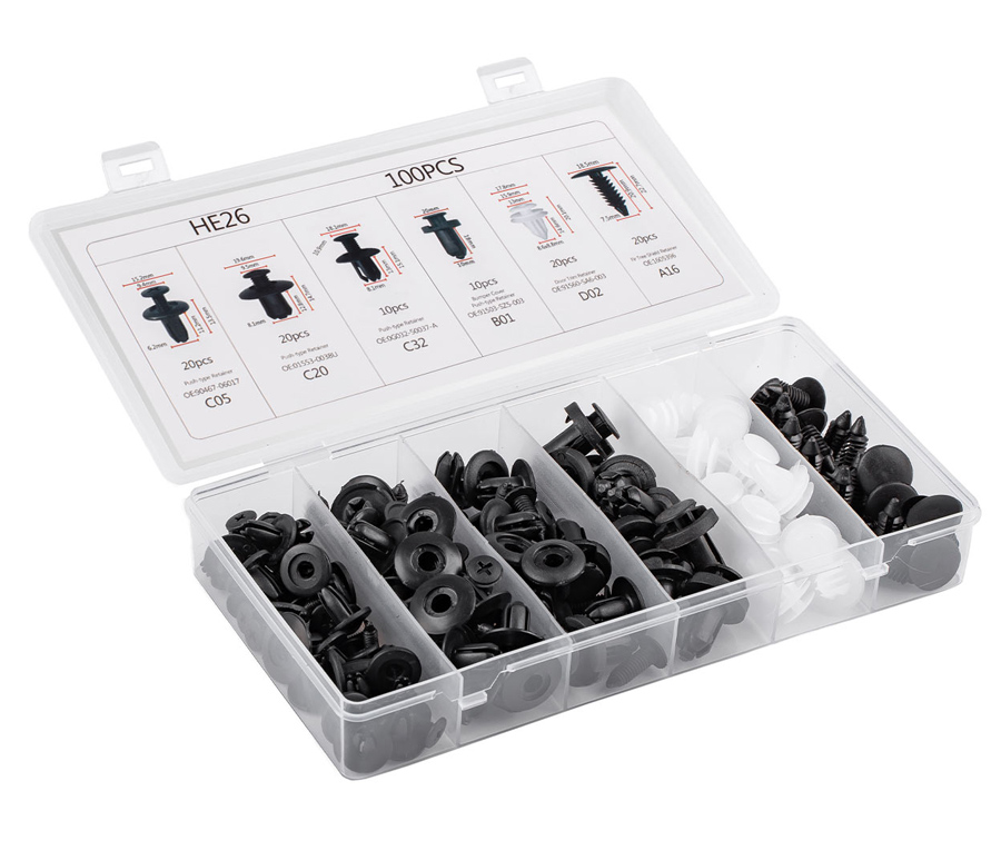 Universal σετ της Amio που αποτελείται από 100 κλιπ ιδανικά για ταπετσαρίες, λασπωτήρες, προφυλακτήρες και πόρτες αυτοκινήτων.