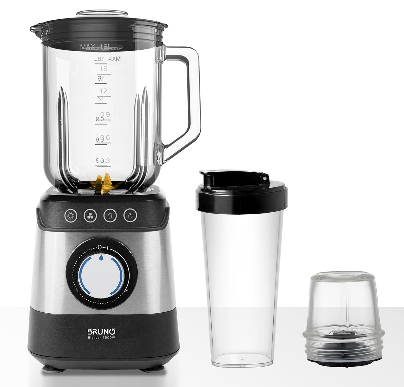 Ανακάλυψε το πολυλειτουργικό μπλέντερ BRUNO 3 σε 1, που συνδυάζει μπλέντερ υψηλής ισχύος (1500W), δοχείο take-away 700ml και αλεστή καφέ/μπαχαρικών σε μία συσκευή!