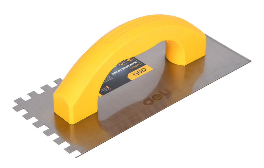Σπάτουλα πλακιδίων της DELI με ανθεκτική λάμα από χάλυβα άνθρακα και πλαστική λαβή. Είναι ιδανική για εργασίες σοβατίσματος και ομοιόμορφη εφαρμογή κόλλας πλακιδίων σε δάπεδα και τοίχους.