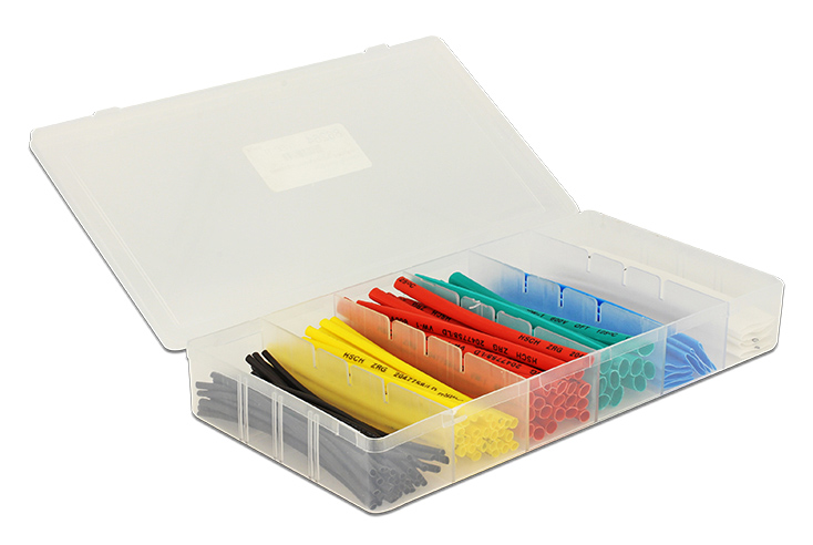 Το σετ περιλαμβάνει 100 θερμοσυστελλόμενα σε 6 διαφορετικές διαμέτρους και χρώματα. Είναι τοποθετημένα μέσα σε πλαστικό κουτί για την ταξινόμηση και προστασία των μονωτικών το οποίο μπορεί να επαναχρησιμοποιηθεί για την αποθήκευση διαφόρων αξεσουάρ.