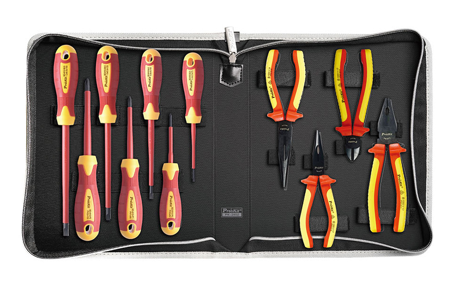 Σετ εργαλείων ηλεκτρολόγου της PROSKIT το οποίο αποτελείται από 7 κατσαβίδια (με μαγνητική μύτη), 2 μυτοτσίμπιδα, 1 πένσα και 1 πλαγιοκόφτη με μόνωση 1000V.