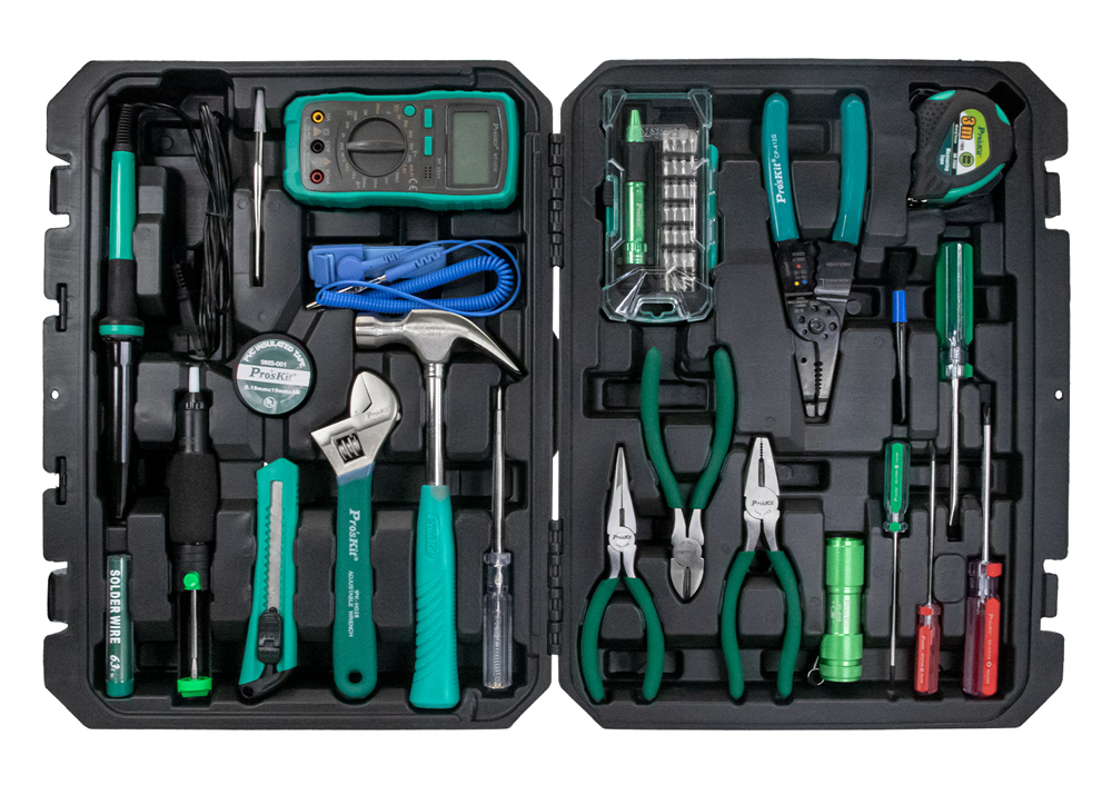Σετ εργαλείων της PROSKIT το οποίο αποτελείται από εργαλεία και εξαρτήματα, κατάλληλα για τεχνικές εργασίες.