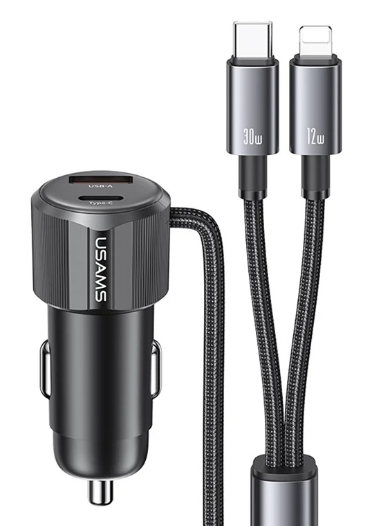USAMS φορτιστής αυτοκινήτου CC287 με 2 σε 1 καλώδιο, USB/USB-C θύρες, 66W, μαύρος